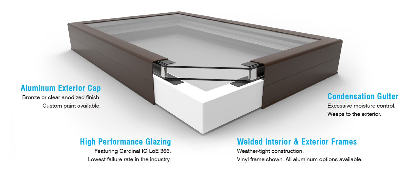 This is our most common curb mount frame featuring a PVC interior frame and a bronze or clear anodized aluminum cap. The PVC interior provides an excellent thermal break. Custom sizes are available. High Load glazing available.